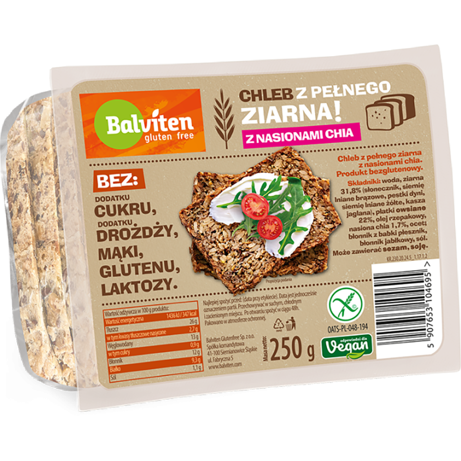 Νερό, άμυλο (καλαμπόκι, ρύζι), αλεύρι ρυζιού, προζύμι (αλεύρι φαγόπυρου, αλεύρι ρυζιού, νερό), σπόροι ηλιόσπορου 3,7%, σπόροι chia 2%, λιναρόσπορος 1,2%, φυτικές ίνες (ψύλλιο, μήλο), λάδι canola, διογκωτικό μέσο (κόμμι ξανθάνης), μαγιά, αλάτι.